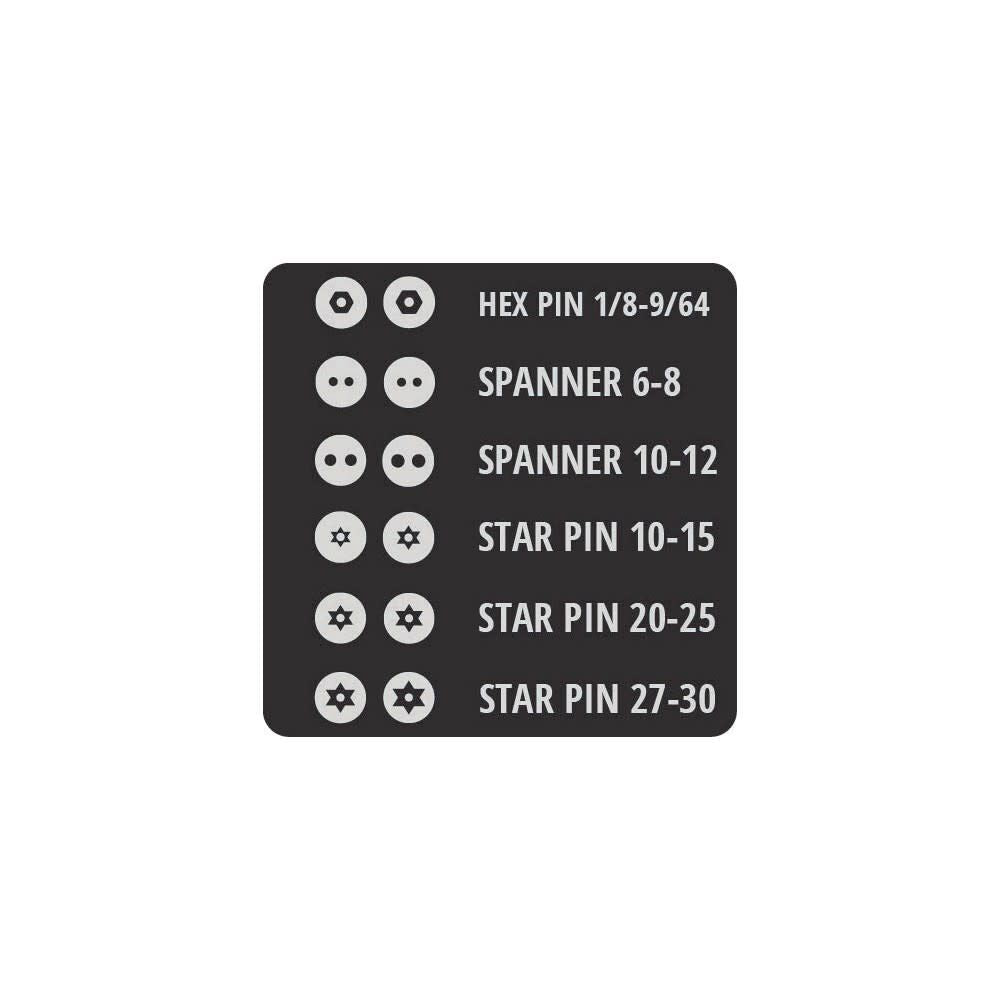 This security screwdriver assortment provides the most popular security bit set: various sizes of Spanners, Hex Pins and Torx Pins.
