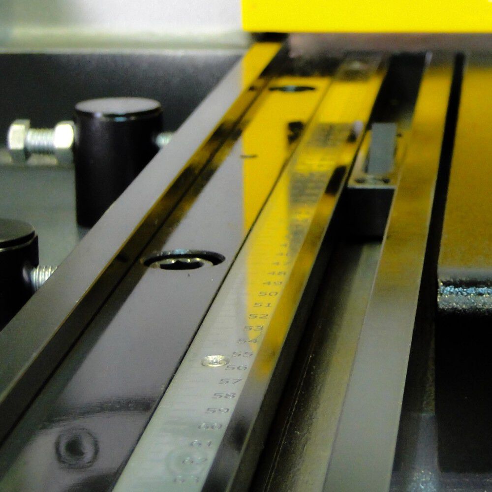 - Back gauge positioner rides on a screwball rail system and uses an encoder for accuracy