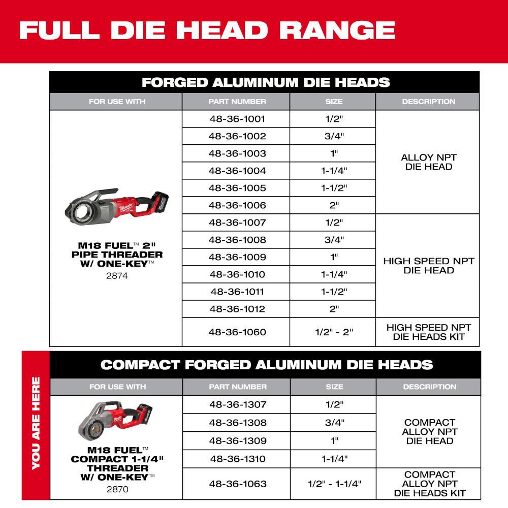 MILWAUKEEÆ Portable Pipe Threading Dies are replacements for: MILWAUKEEÆ Forged Aluminum Die Heads, MILWAUKEEÆ Compact Forged Aluminum Die Heads,†RIDGID†11-R, 12-R, O-R, 111-R, 00-R, 30A and 31A Threaders, Reed R-12+ Dropheads, DeWalt Pipe Threading Die†Heads, and Wheeler Rex 12R Style Die Heads.