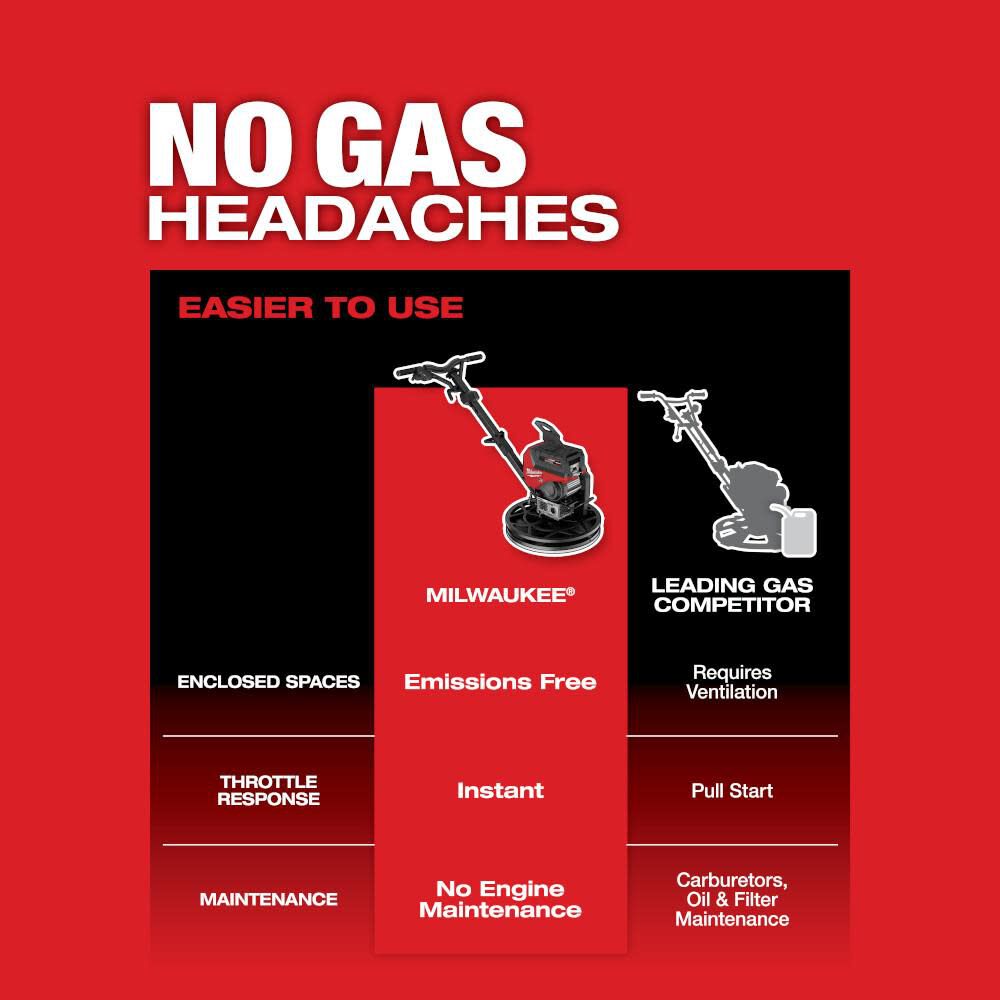 The MILWAUKEEÆ MX FUEL 24Äù Walk- Behind Edging Trowel provides a smooth, balanced finishing experience with 5HP performance, no gas headaches, and 35 min of runtime per charge.