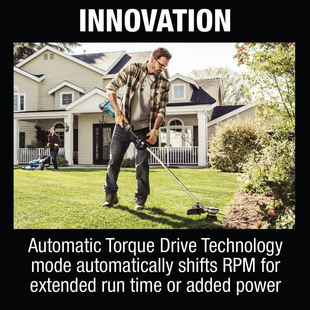 Trimmer has automatic torque drive technology mode that automatically shifts from 3,500 to 6,500 RPM for extended run time or added power.