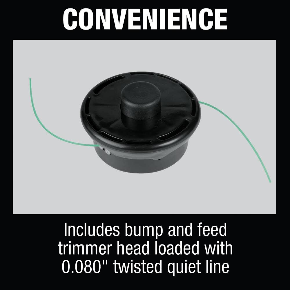 - Includes bump and feed trimmer head loaded with 0.080" twisted quiet line