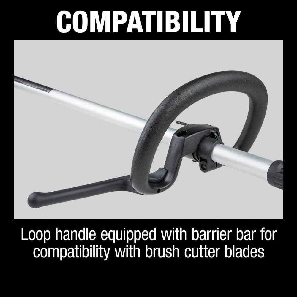 The loop handle comes with a barrier bar that makes it compatible with brush cutter blades.