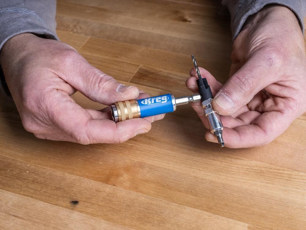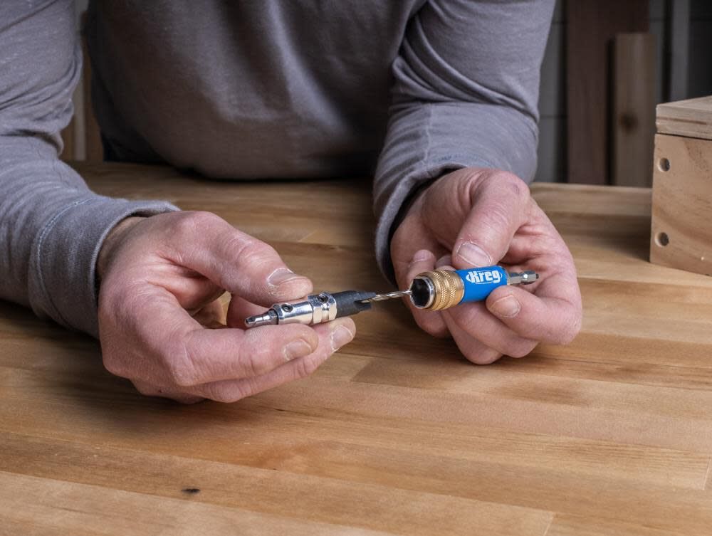 On one end, a drill bit is sized to drill a perfect pilot hole for a Kreg Screw, plus a cutter that drills a flat-bottomed counterbore that the screw head fits into.