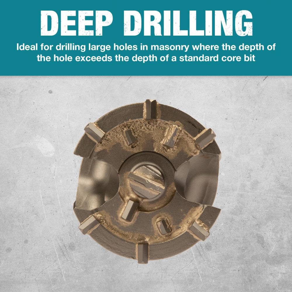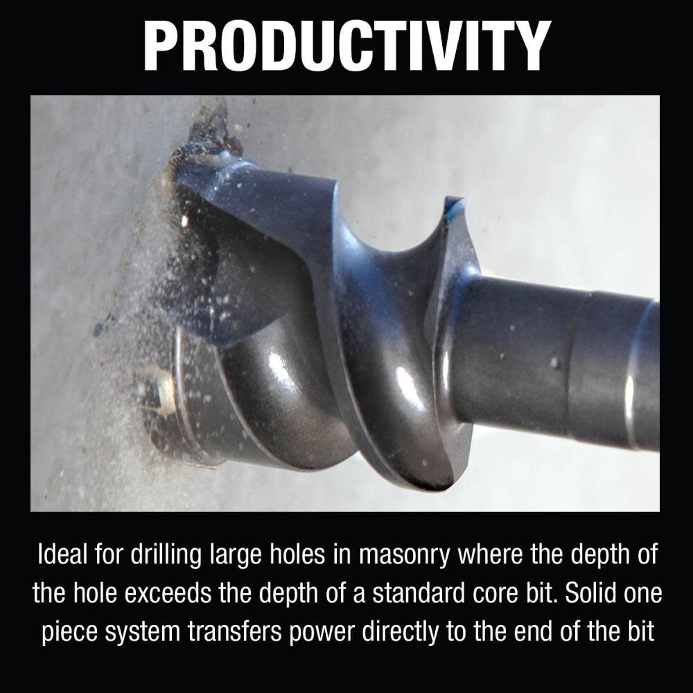 This bit is ideal for drilling holes in concrete, block, and brick where the depth of the hole exceeds the depth of a standard core bit.