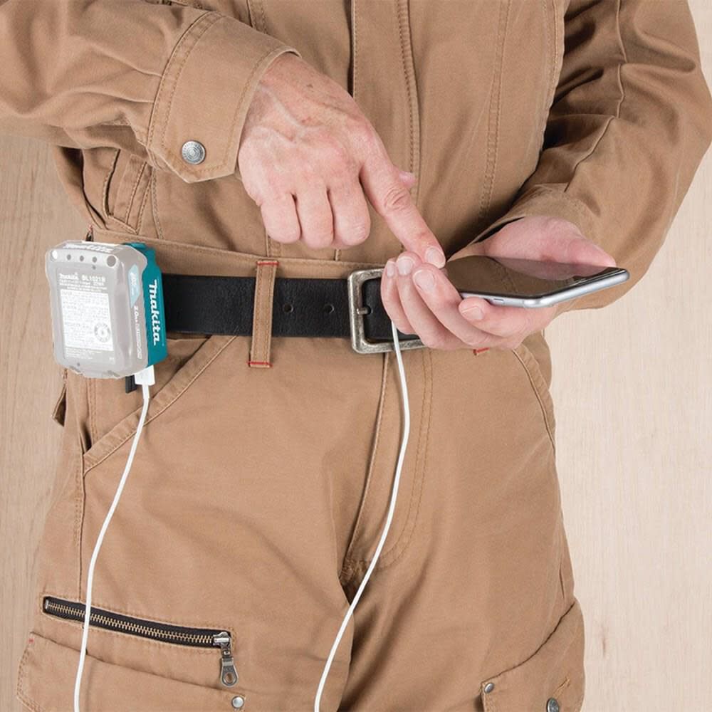 The Makita 12 Volt cordless power source is designed to charge one USB compatible electronic device.