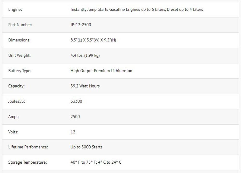- Jump-Starts Gasoline Engines up to 6 Liters and Diesel up to 4 Liters with an Impressive 2500A and 33300 Joules5S So You Will Never Be Stranded Again