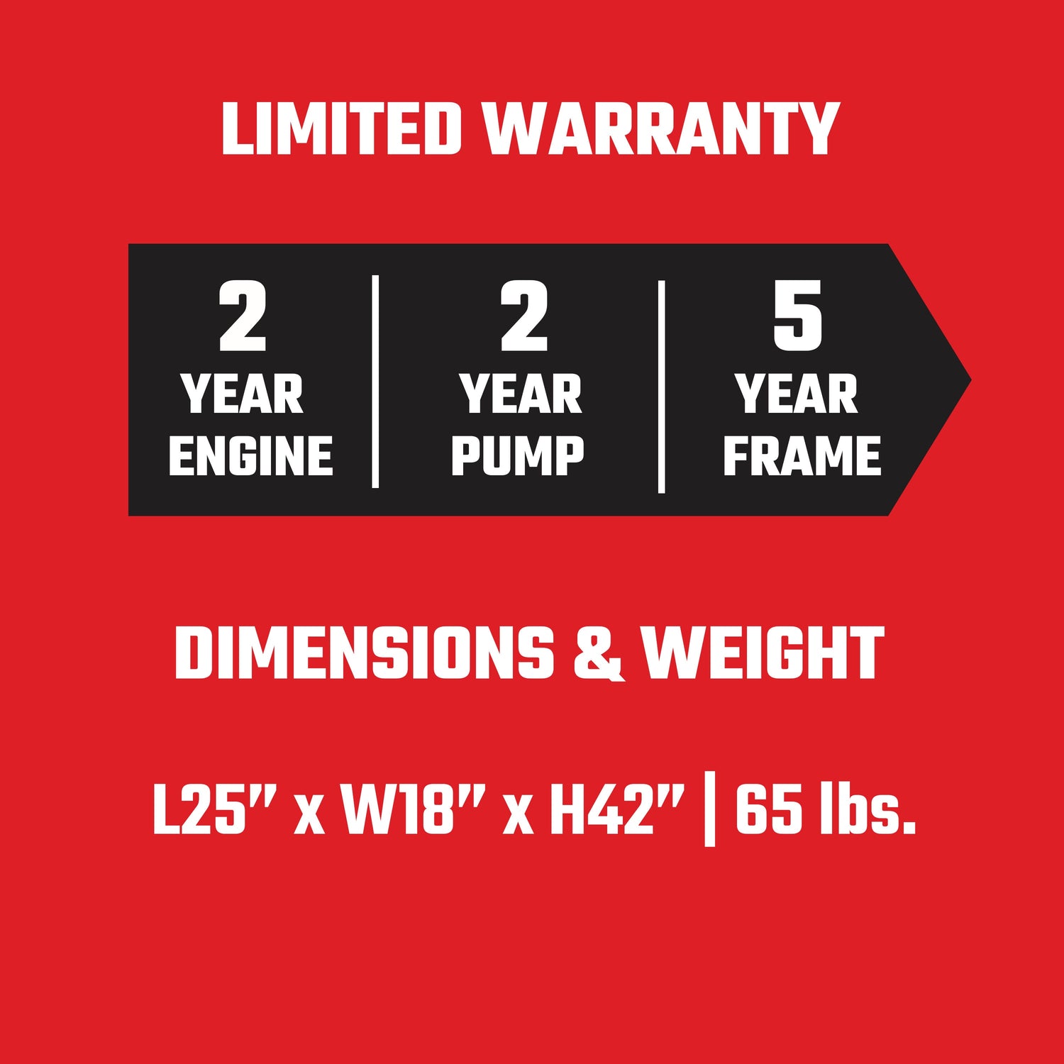 2 year limited pump warranty, 3 year limited engine warranty, 5 year limited frame warranty, 90 day limited accessory warranty