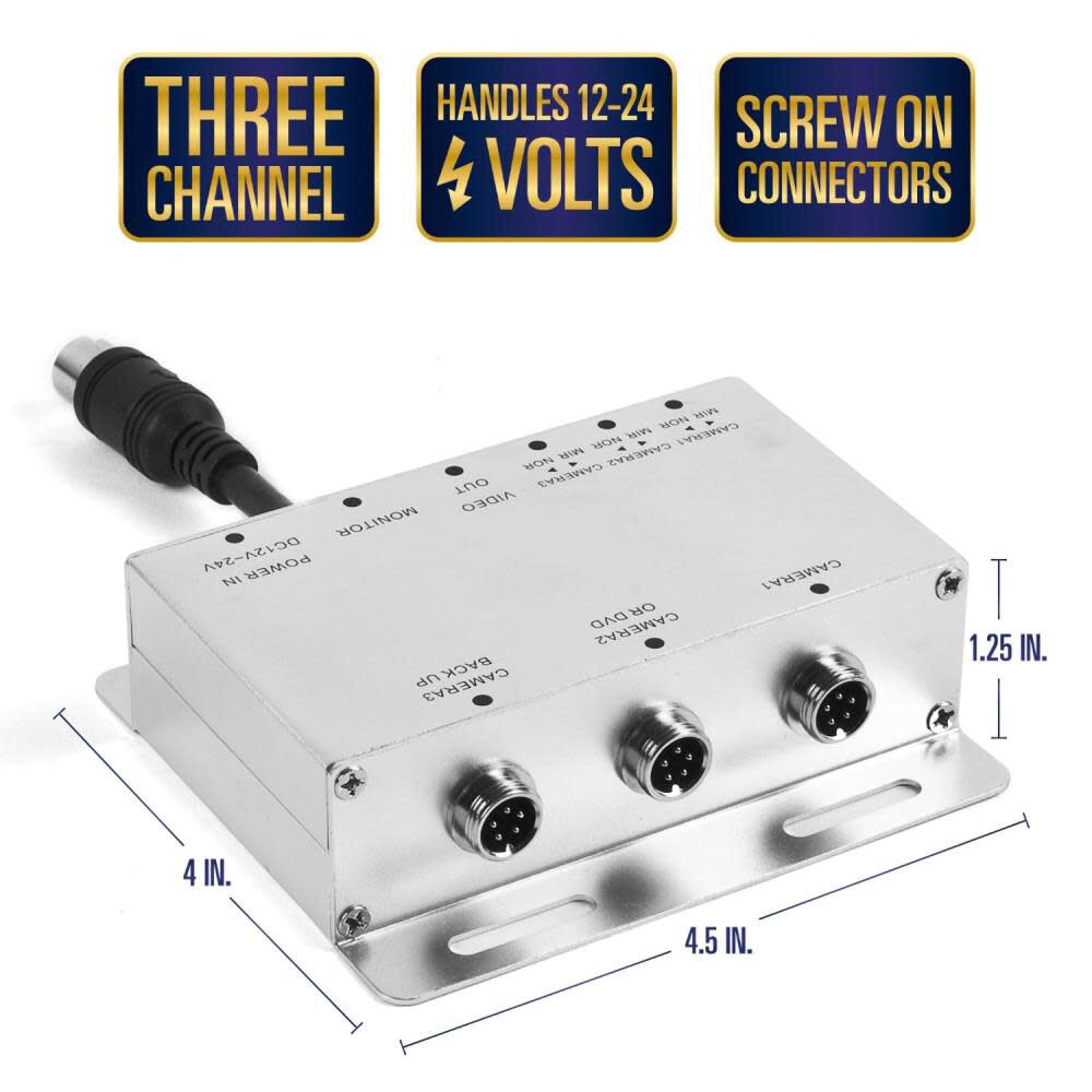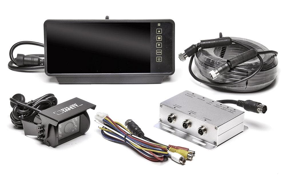 Package Contents - Backup Camera, Replacement Mirror Monitor, Multiplex Control Unit, Cable, Remote Control, Power Connection Wire, Double RCA + Power Converter, Screw Kit, Owner's Manual