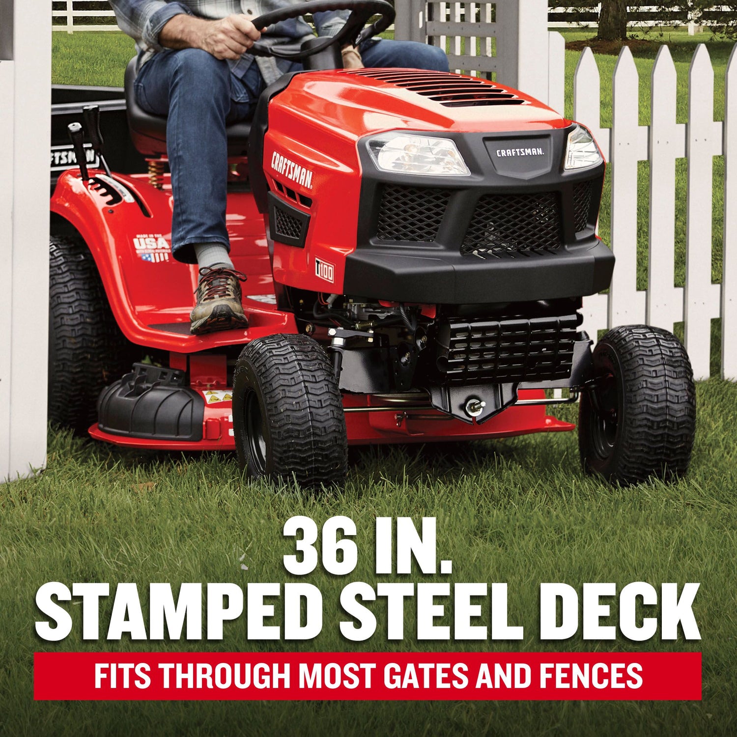 TIGHT SPACES: 36-in reinforced stamped steel deck cuts up to 1 acre with ease and fits through most gates and tight spaces