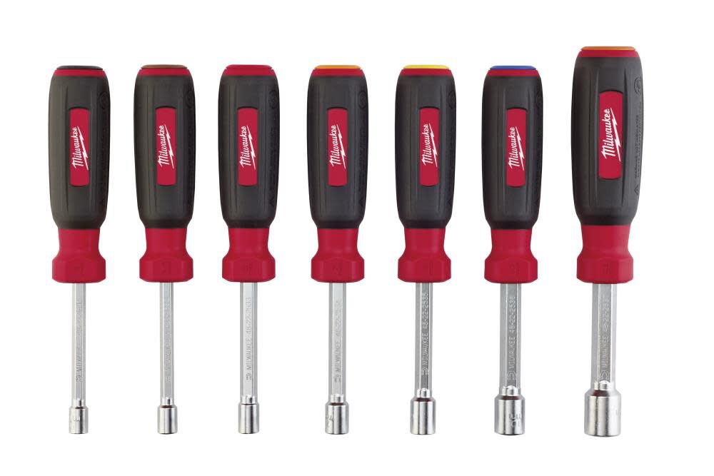 The seven-piece MilwaukeeÆ Magnetic Metric Nut Driver Set includes a universal head that adapts to four times more fasteners, including square, 12-point, 8-point, and hex nuts.
