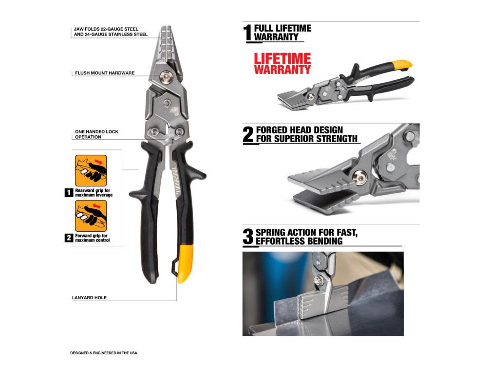 - Offset blades keep hands away from cutting material so they are ideal for continuous straight cuts and long left cuts