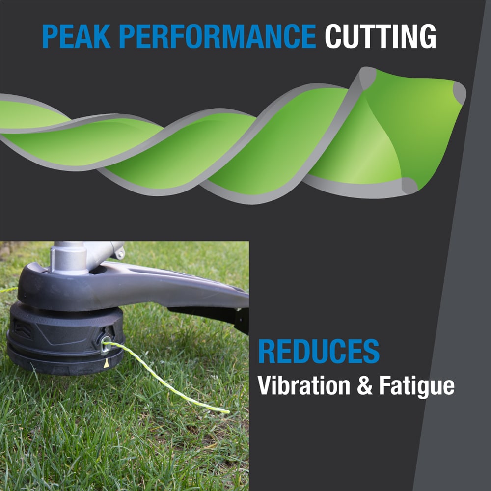The aerodynamic twist shape reduces line resistance and vibration, keeping the trimmer from slowing down, using less battery energy and cutting more.