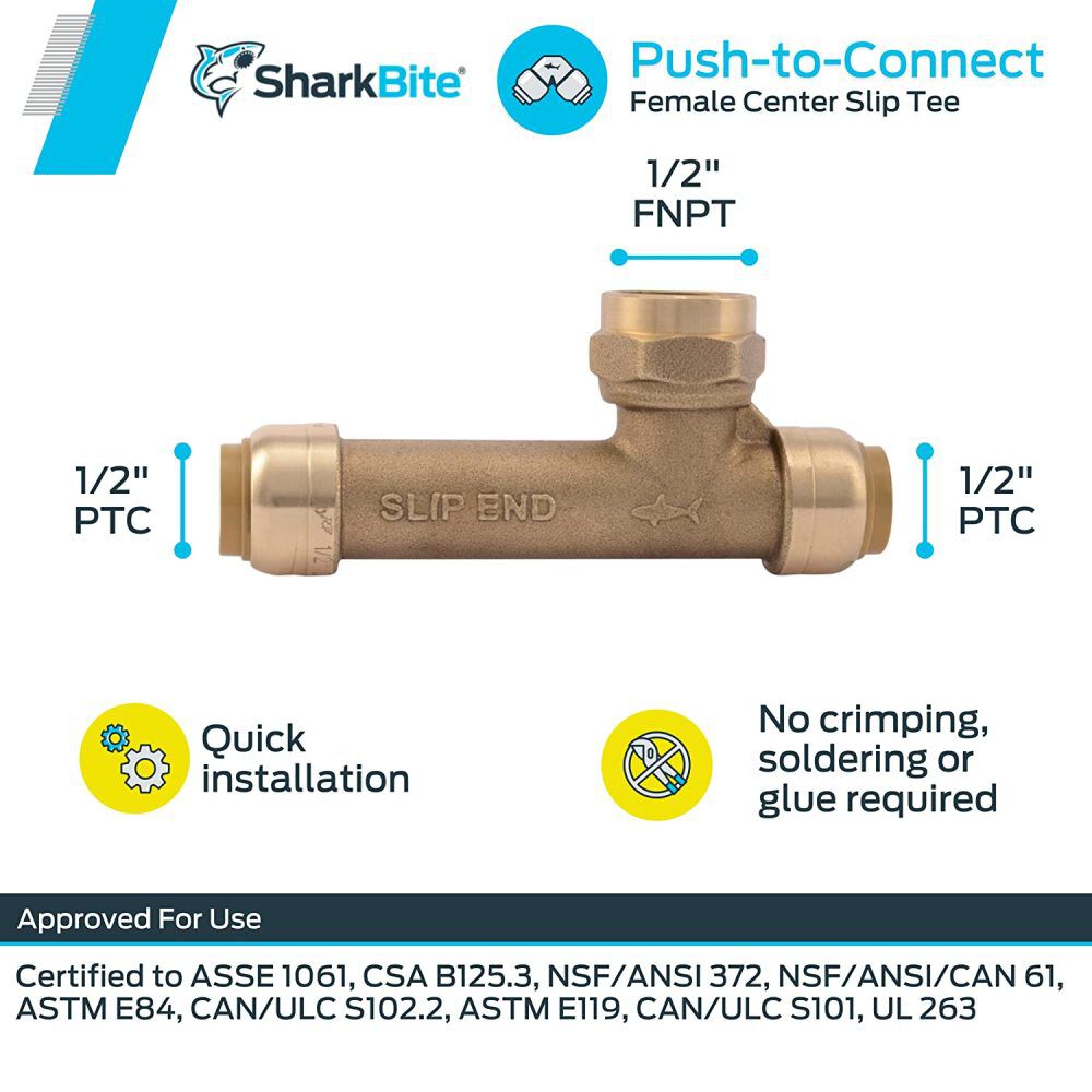 Sharkbite 1/2 x 1/2 x 1/2in Brass Female Center Slip Tee