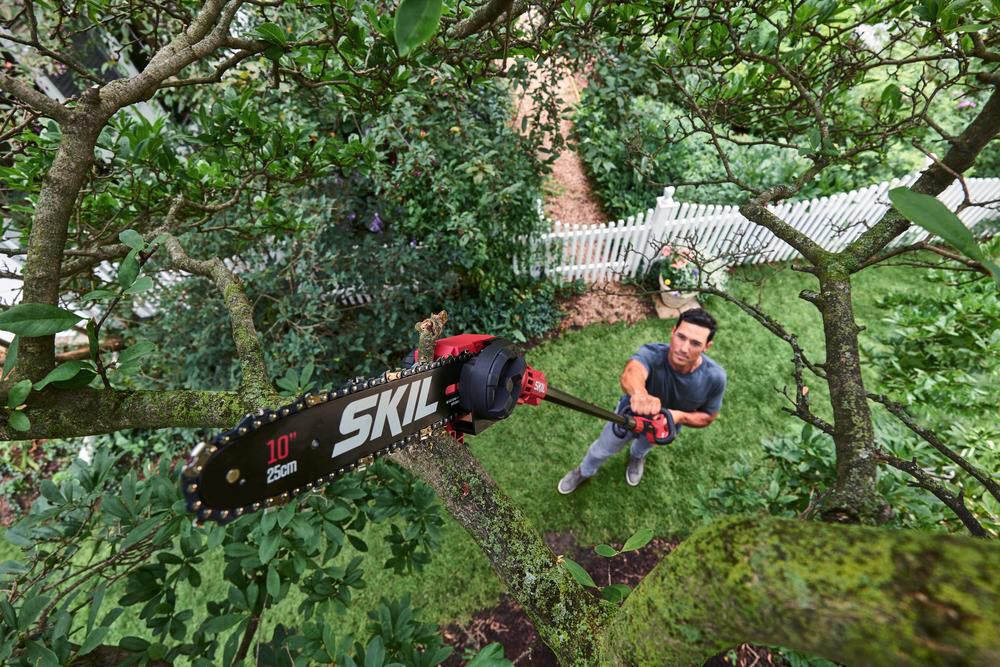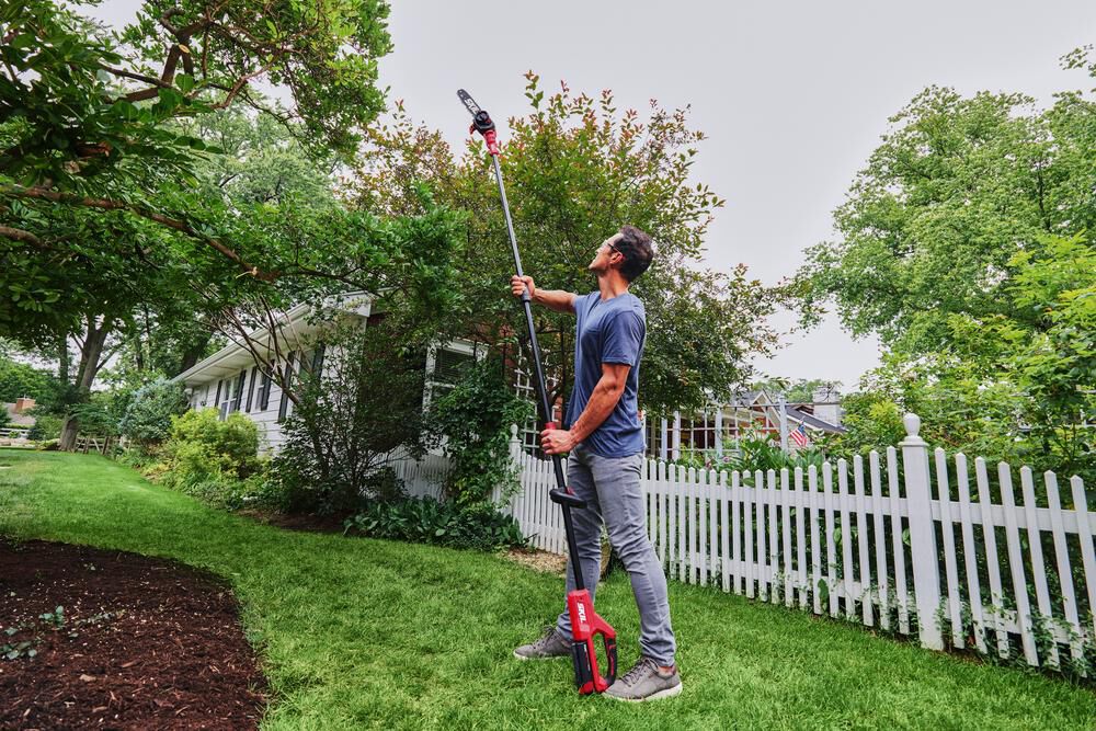 Power through tasks faster with tool-less chain tensioning and auto-lubrication and reach up to 10 feet with the lightweight, telescoping aluminum shaft.