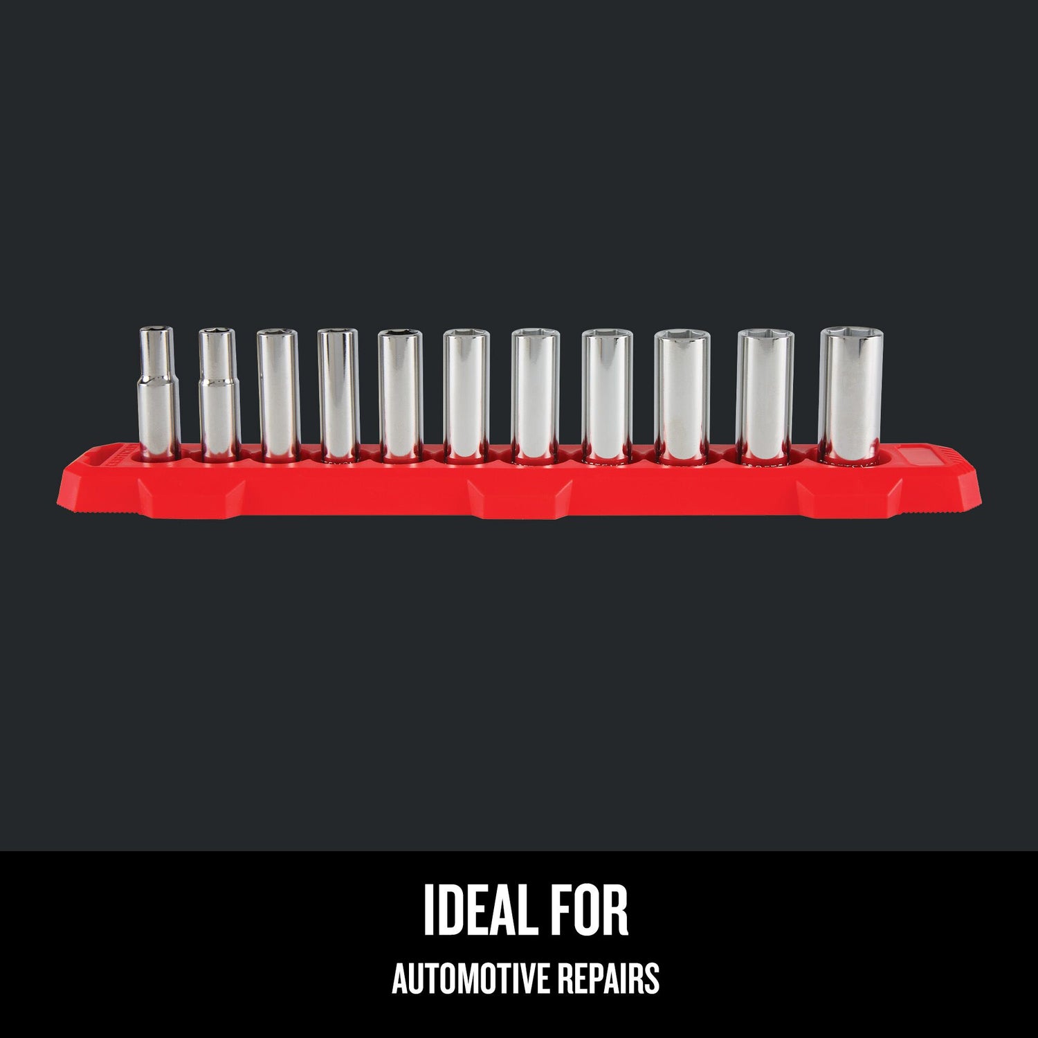 Includes (11) 3/8-in Drive Deep 6 Point Sockets Metric (9mm, 10mm, 11mm, 12mm, 13mm, 14mm, 15mm, 16mm, 17mm, 18mm, 19mm)