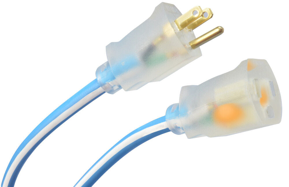 Heavy duty 12/3-wire SJEOW Blue/White cold supreme extension cord W/lighted end, 50-feet.