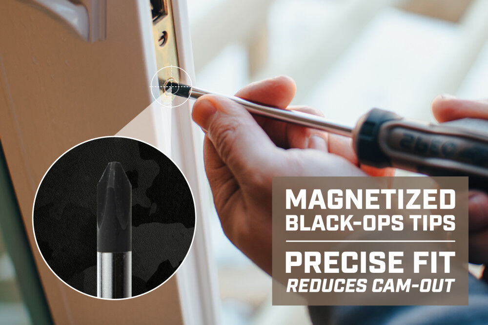The magnetized, Black-Ops Coated Tips provide a precise fit that reduces cam-out.