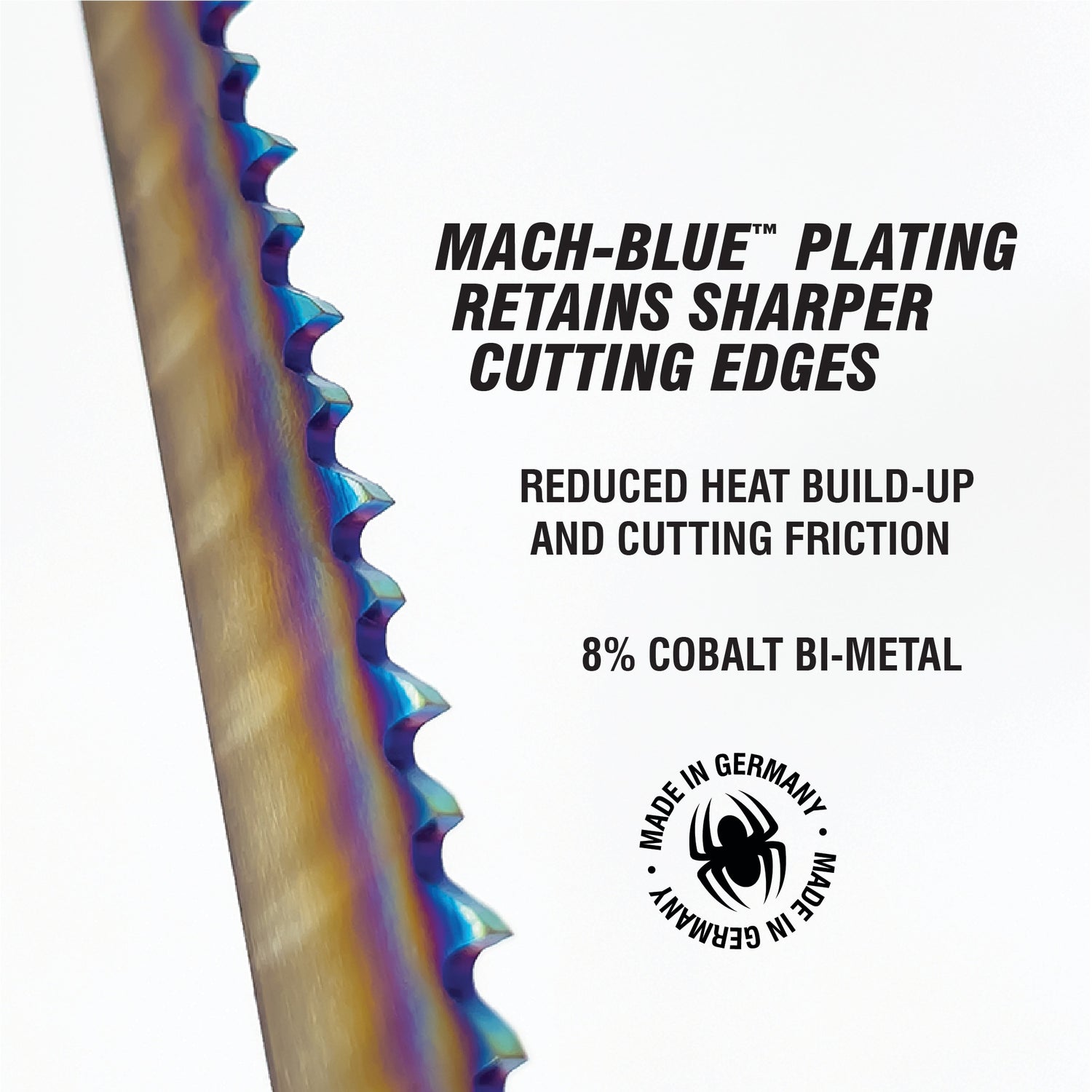 Super hard Mach-Blue™ plating retains sharper cutting edges, and reduces heat build-up and cutting friction - yielding up to 20x more cuts than conventional bi-metal blades.