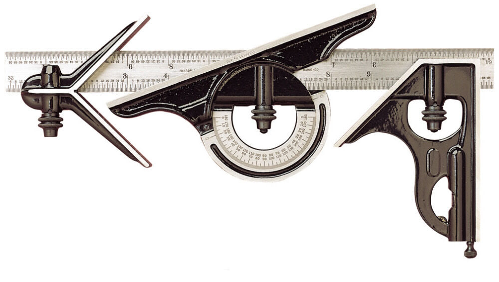 This StarrettÆ complete combination set features the combination square with a center head and with reversible protractor.