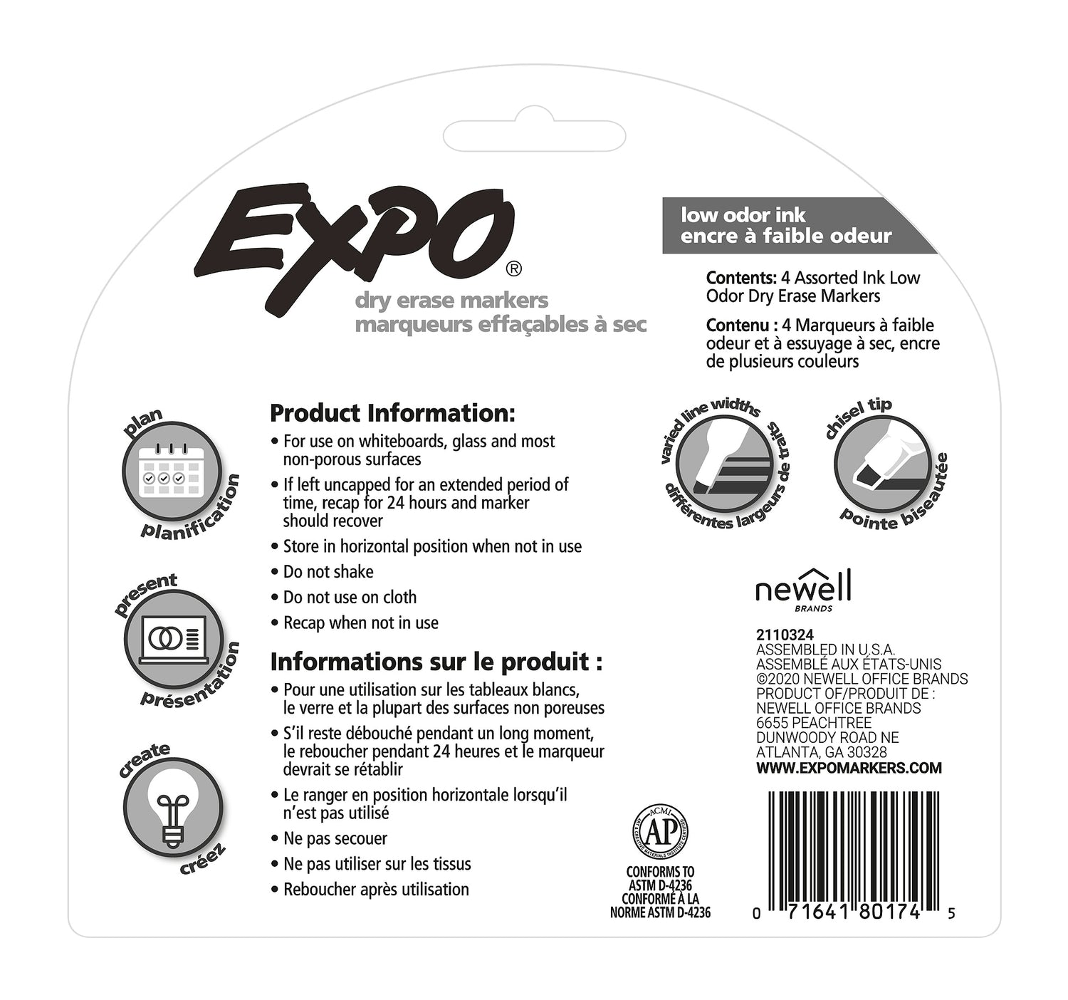 Expo low odor dry erase markers feature vivid ink that is easy to see from a distance and provides consistent color quality.