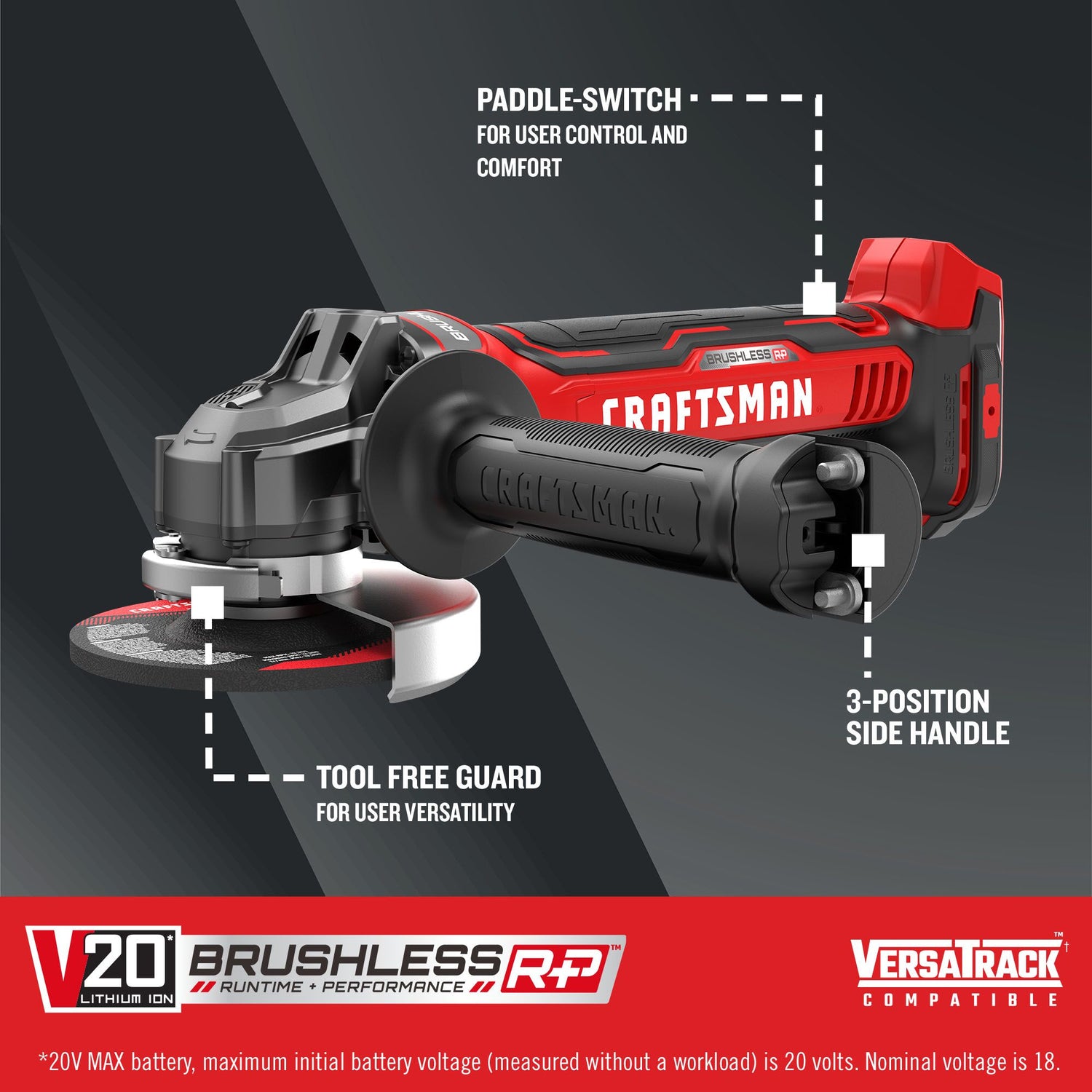 BRUSHLESS MOTOR: Up to 65% more power compared to CRAFTSMAN brushed Grinder CMCG400 by measuring the unit output measured in unit watts out (UWO) with 4.0 Ah battery (sold separately)