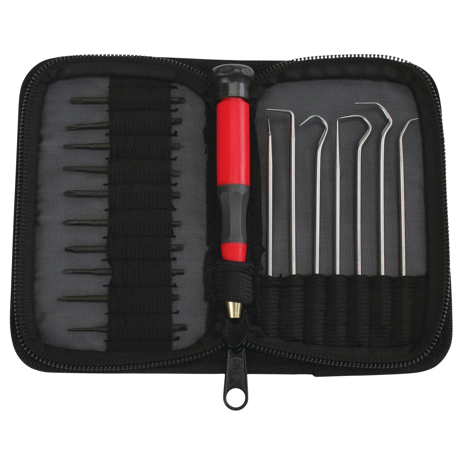 Includes SL 3/64-in, SL 1/16-in, SL 5/64-in, SL 3/32-in, PH #000, PH #00, TX5, TX6, TX7, TX8 and 8 probes (35° bend, 90° bend, 180° loop straight, 180° hook, triple bend, double bend)