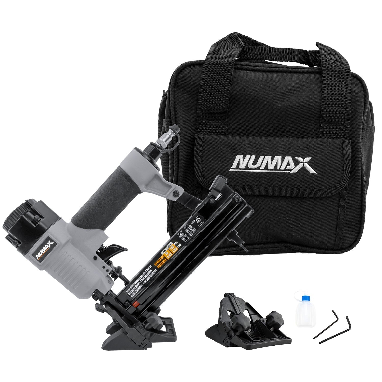 mini flooring nailer and stapler includes a durable canvas carrying bag with zipper, air tool oil and adjustment tools and is covered by Numax 1-year limited warranty and 30-day wearable parts warranty.