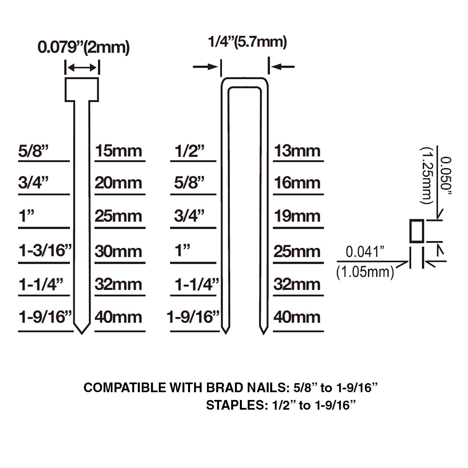 Compatible with 18-Gauge brad nails from 5/8 in to 1-5/8 in and 18-Gauge 1/4 in narrow crown staples from 1/2 in to 1-5/8 in