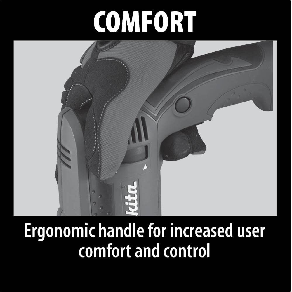The Makita 5/8 Inch hammer drill is powered by a powerful 6 Amp motor that delivers up to 0 to 2800 RPM and 0 to 44,800 BPM for most demanding applications.