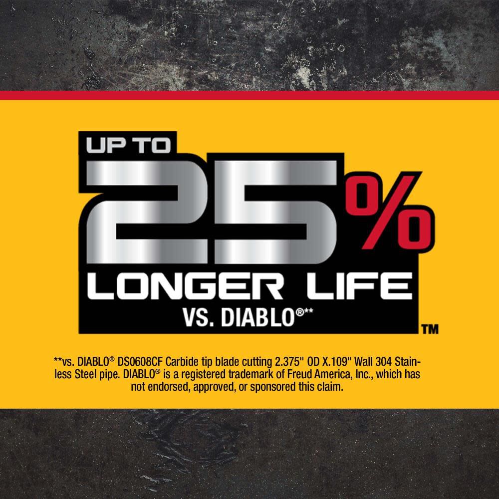 - Versus DIABLO® DS0608CF carbide tip blade cutting 2.375-in. OD X 0.109-in. Wall 304 Stainless Steel pipe. DIABLO® is a registered trademark of Freud America, Inc., which has not endorsed, approved, or sponsored this comparison