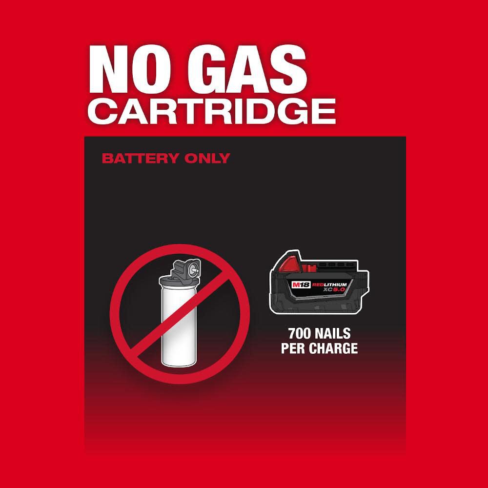 The cordless framing nailer uses only Milwaukee's REDLITHIUM batteries (not included) and sealed compressed nitrogen to drive each nail, eliminating the cost of gas cartridges and associated maintenance.