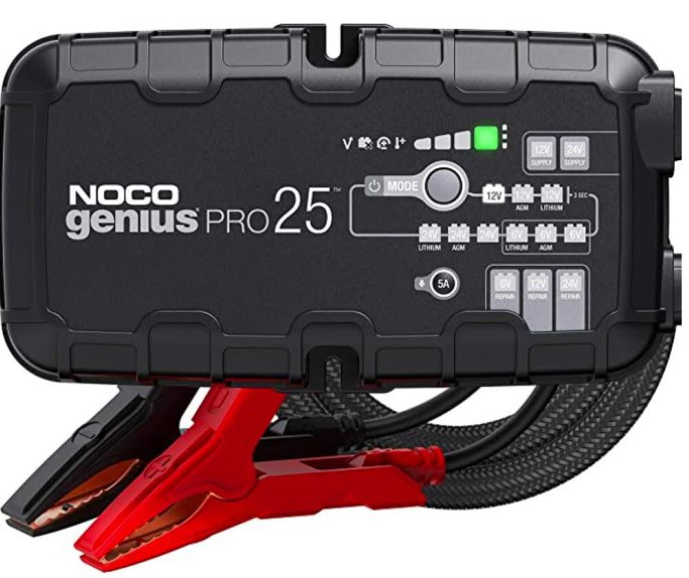 With a high efficiency design the Noco Genius Pro 25 is great for batteries 6V and 12V batteries 20Ah to 1000Ah and 24V up to 500 Ah.