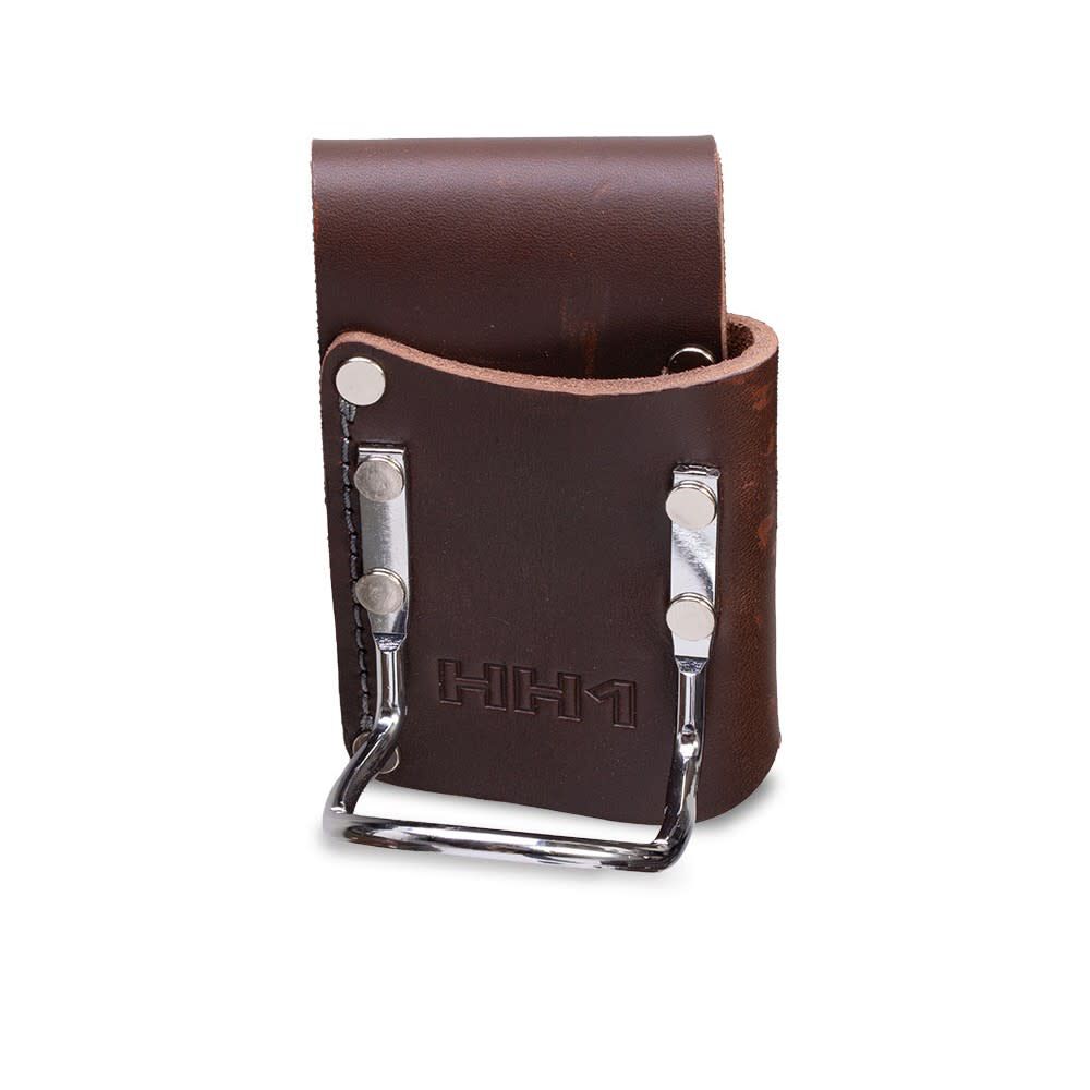 Our Hammer holder with belt loop has a stamped metal hammer loop, riveted to tanned cow leather with an additional stitched and riveted leather tool loop, for convenient hammer and tool carrying capability.