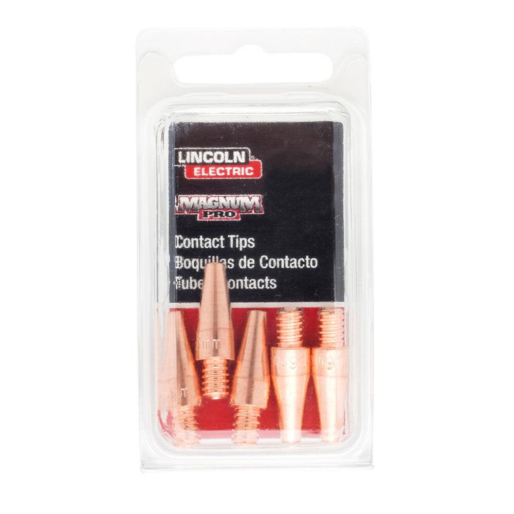 The Lincoln Electric LE31MP wire feed welder contact tips (5-Pack) are designed as replacement tips for solid and flux-cored welding wire with a diameter of 0.035 in.