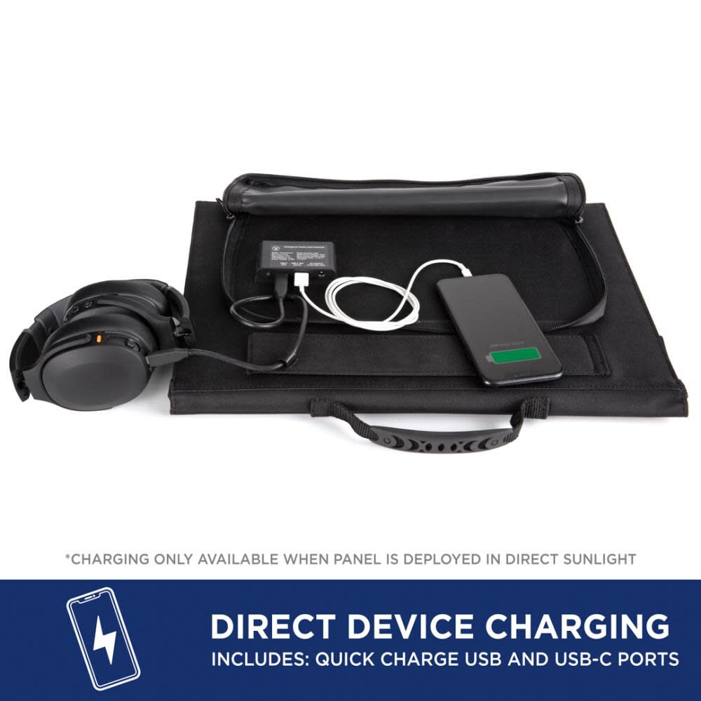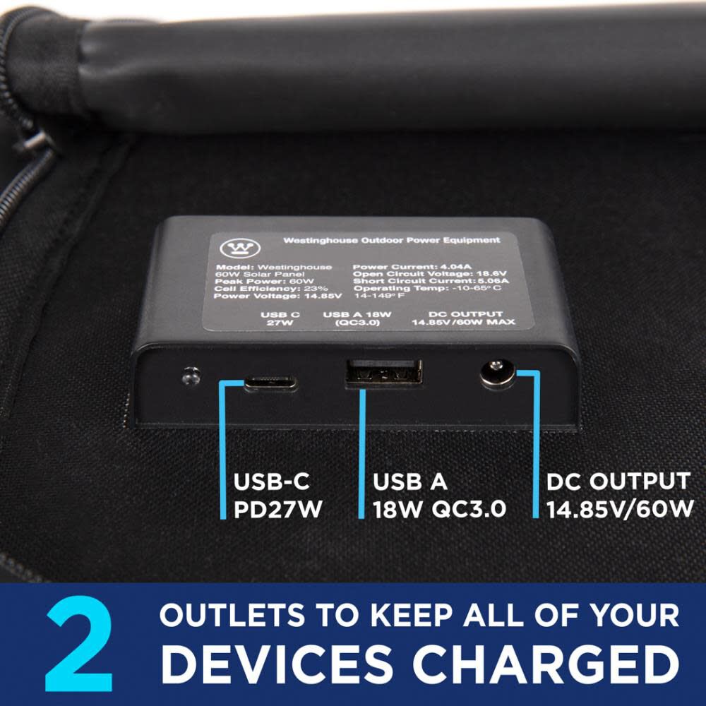 - Portable solar panel provides up to 60w and 14.85V of on-the-go power