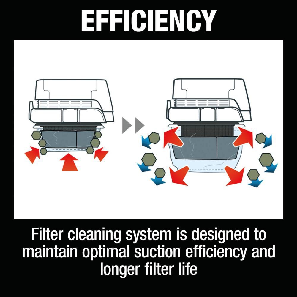 - Automatic self-cleaning filter system compresses and expands damper shaking dust from pre-filter maintaining optimal suction and longer filter life
