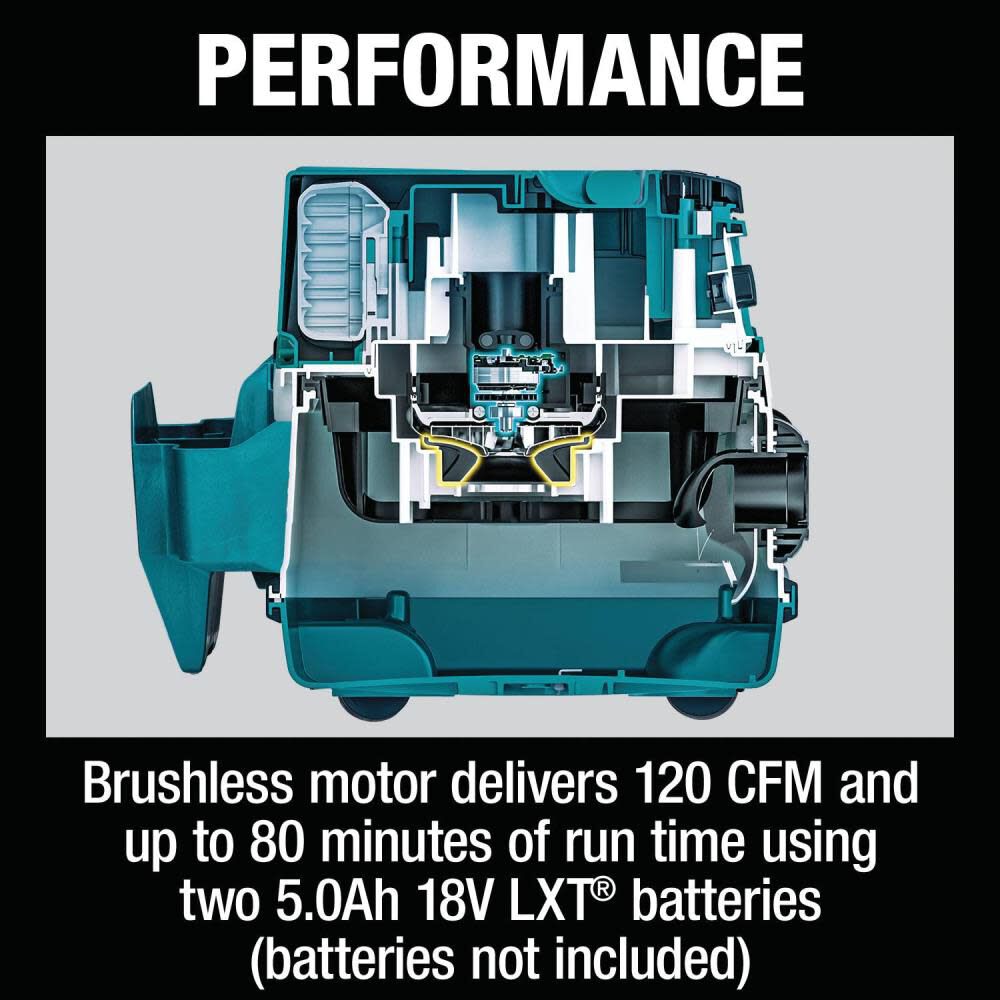 - Powerful Makita-built brushless motor delivers 120 CFM and 44" water lift of suction