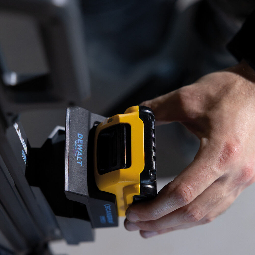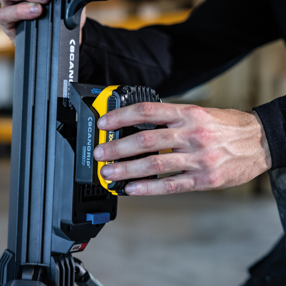 Tower 5 Connect is compatible with Metabo/CAS battery system 18V and all other 18V/20V battery packs from leading power tool brands by using the Scangrip Connector.