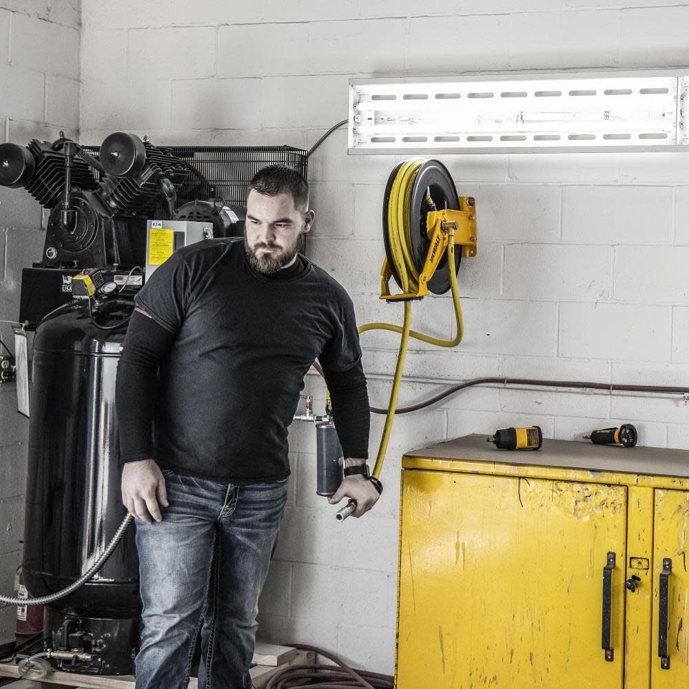 Double arm hose reel is the perfect accessory for any air tool and any air compressor that operates at 250 psi or less.