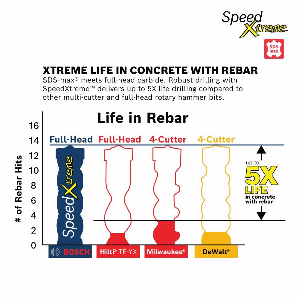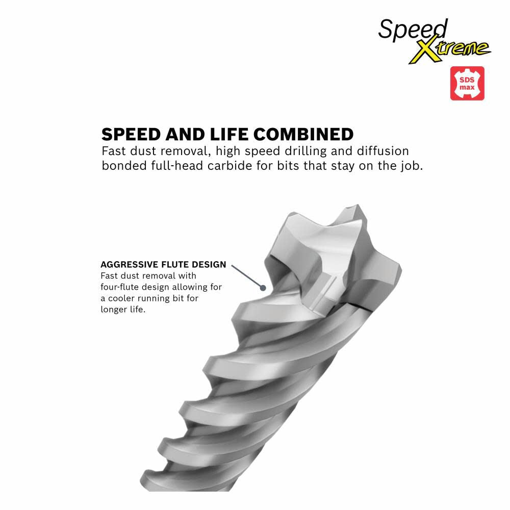 Bosch SpeedXtreme SDS-maxÆ drill bits deliver 100% carbide heads with four-cutter design, making them the toughest, long-lasting bits for drilling in reinforced concrete and hard aggregate.