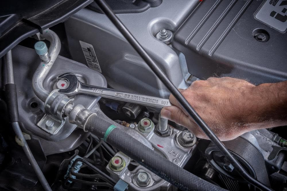 GEARWRENCH 90-tooth reversible ratcheting wrench swing arc of just 4∞ turns fasteners in extremely tight spaces.