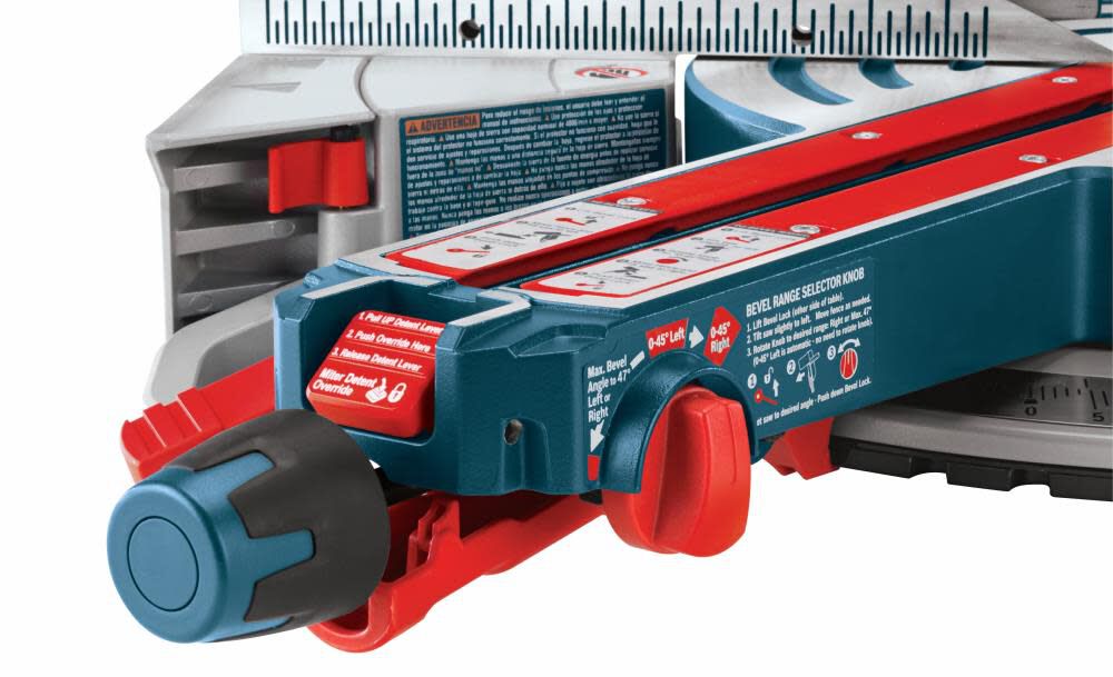 The saw's all-metal bevel lock lever and range selector are located up front to make bevel adjustments easy.