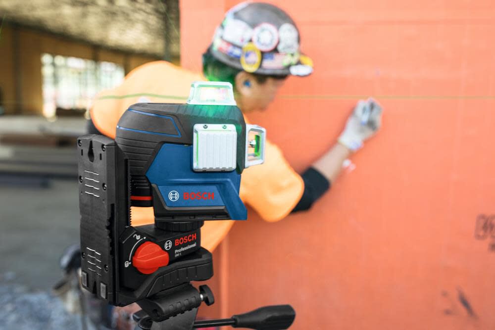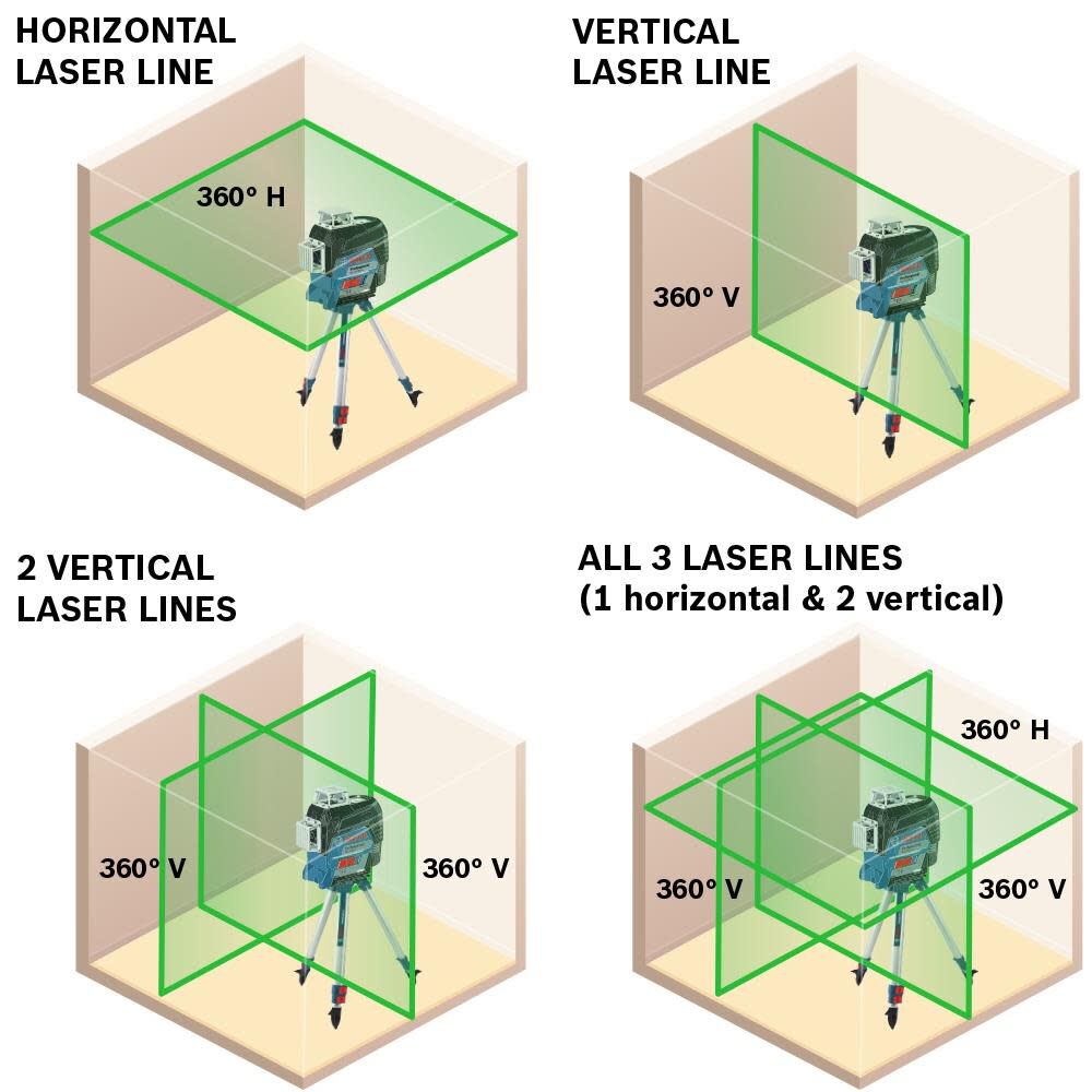 The leveling laser generates three green-beam laser chalk lines in 360° laser planes – one horizontal and two vertical.