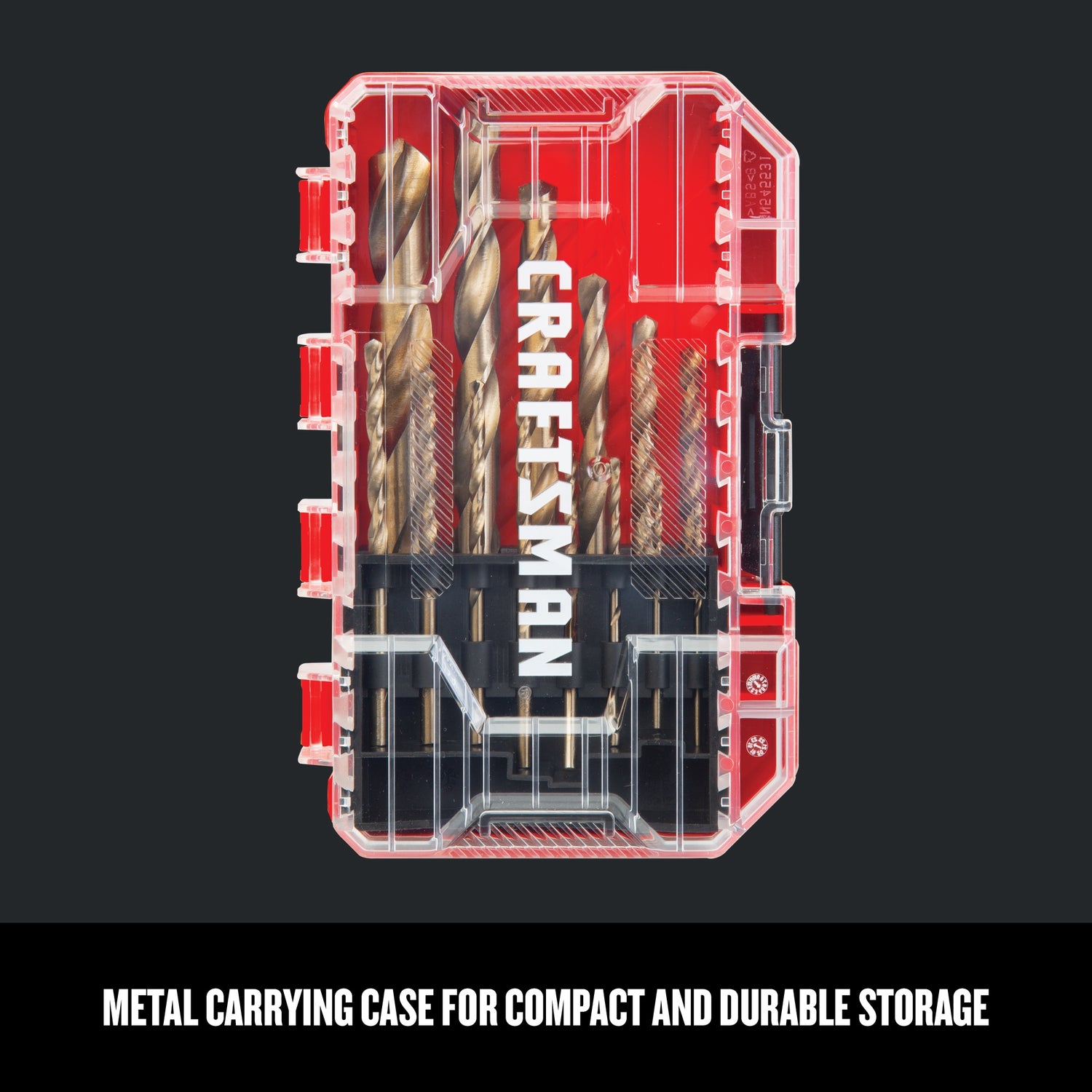 Includes (14) GOLD OXIDE DRILL BITS: 1/16-in, 15/64-in, 3/32-in, 7/64-in, (2) 1/8-in, 9/64-in, 5/32-in, 3/16-in, 7/32-in, 1/4-in, 5/16-in, 3/8-in, 1/2-in