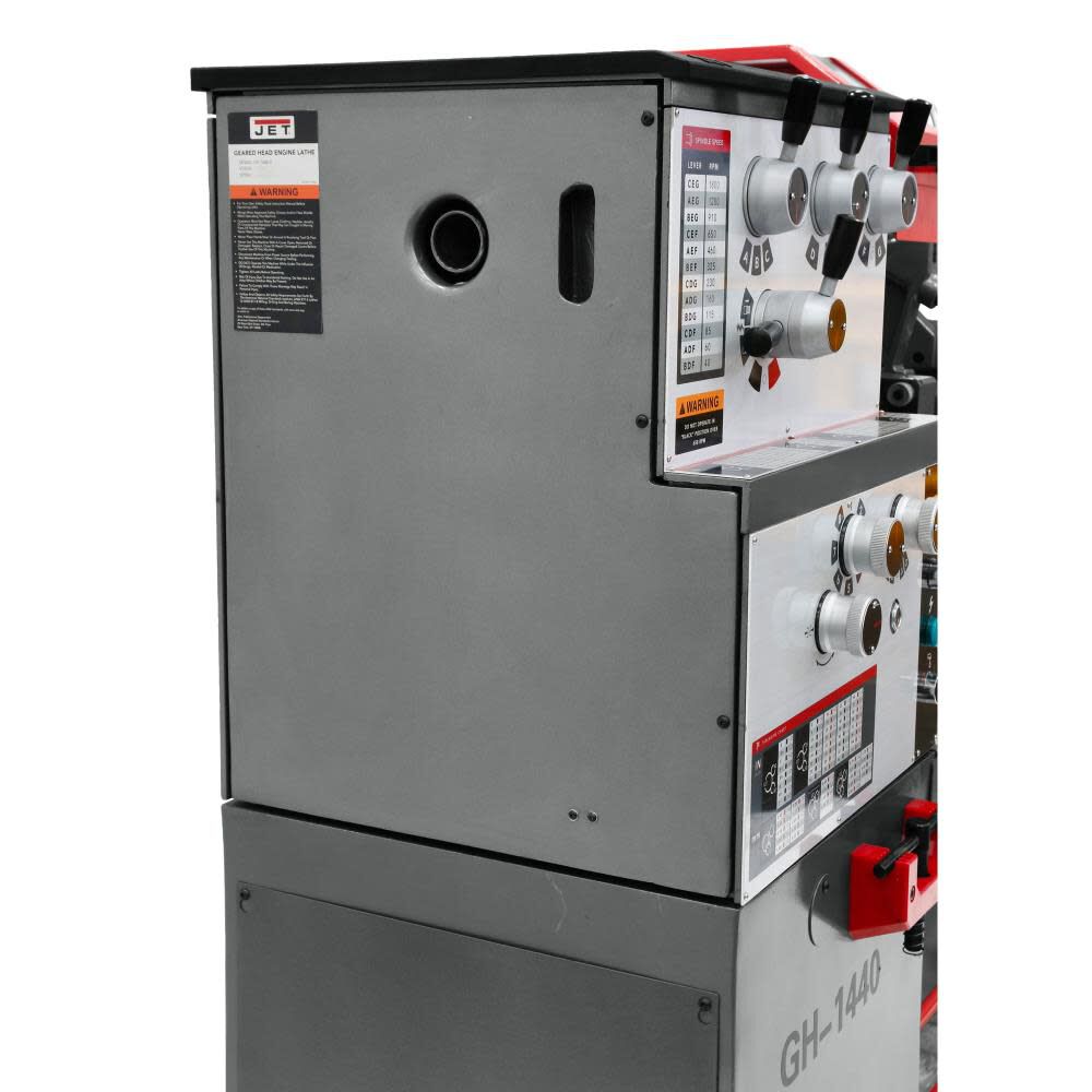The new Jet GH-1440-1 and GH-1440-3 geared head engine lathes weigh over one ton and come equipped with precision induction hardened ground bed-ways, spindle roller bearings, and high-quality steel hardened gears in the headstock for the ultimate working durability.