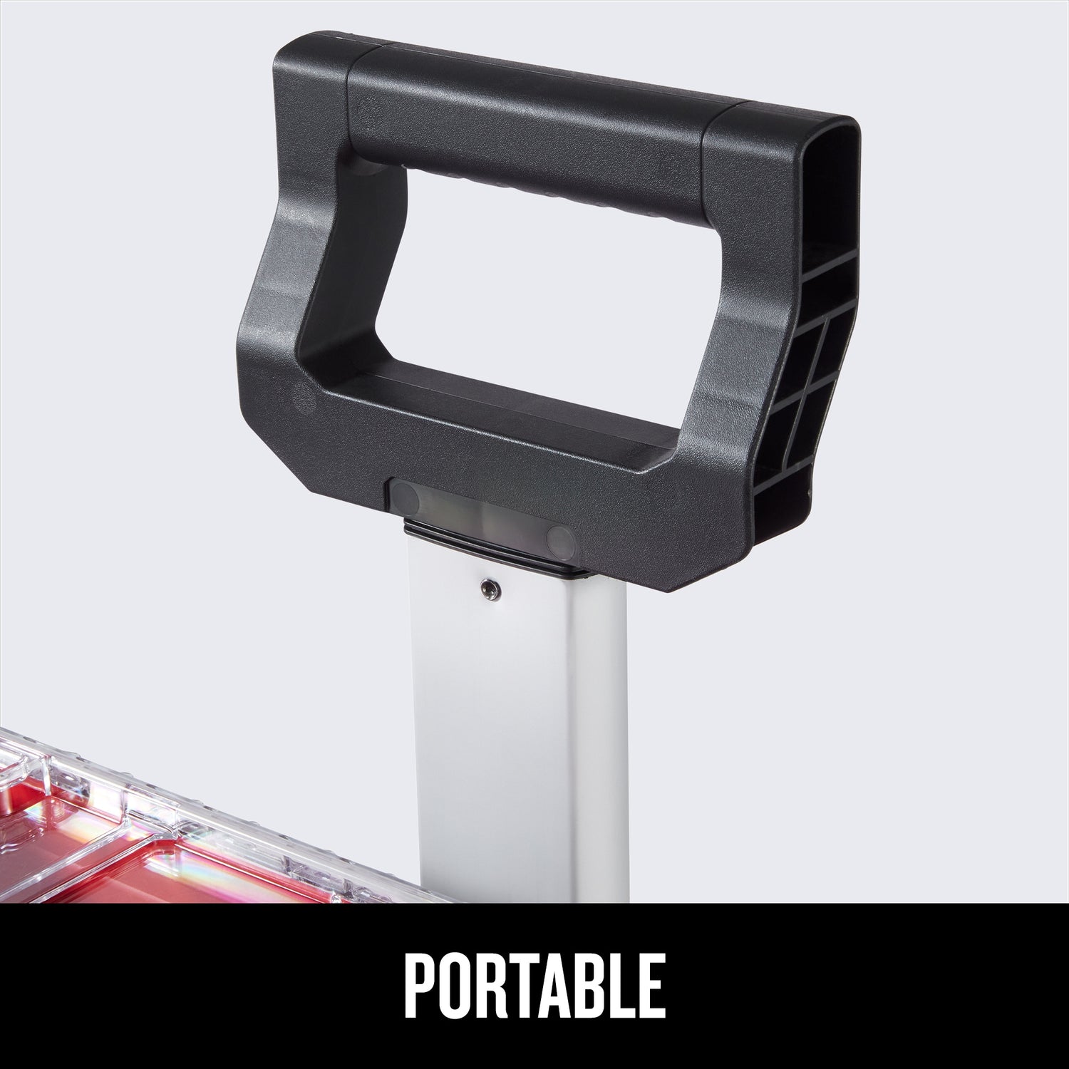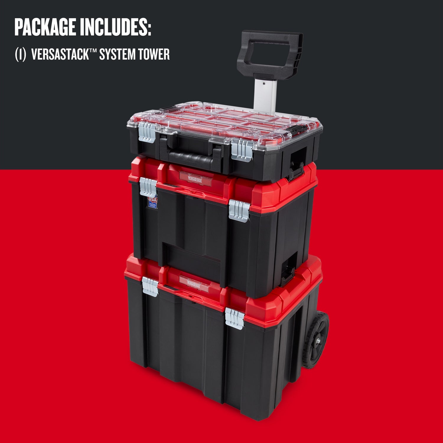 COMPLETE MOBILE TOOL BOX: Rolling tool chest tower includes 1 extra large mobile bottom unit, 1 deep storage unit for large tools, and 1 top unit with organization compartments and a heavy duty clear lid for full visibility