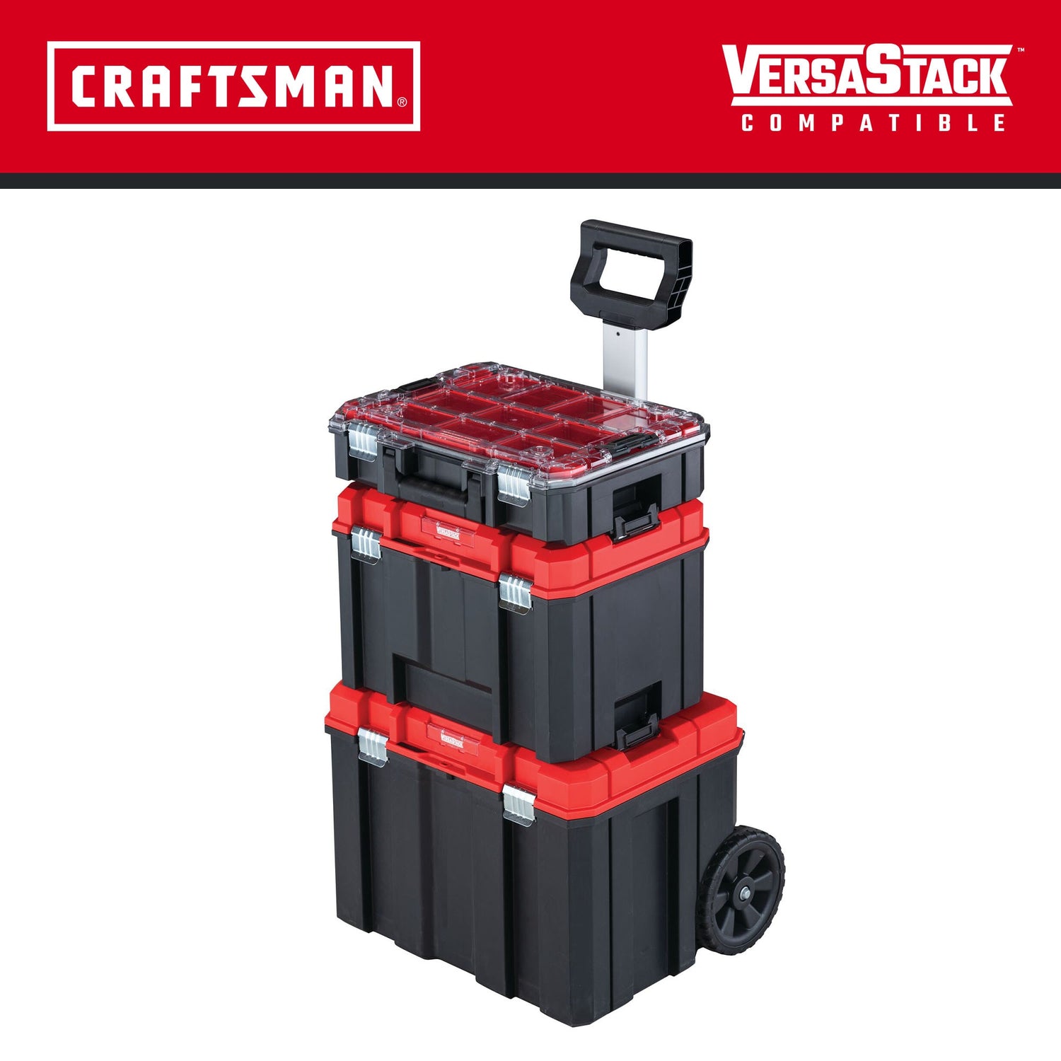The CRAFTSMAN VERASTACK™ Rolling Tool Box Tower features handy tool organizers and storage for a wide range of tool sizes, within this stackable, portable system that rolls with you wherever you need to work