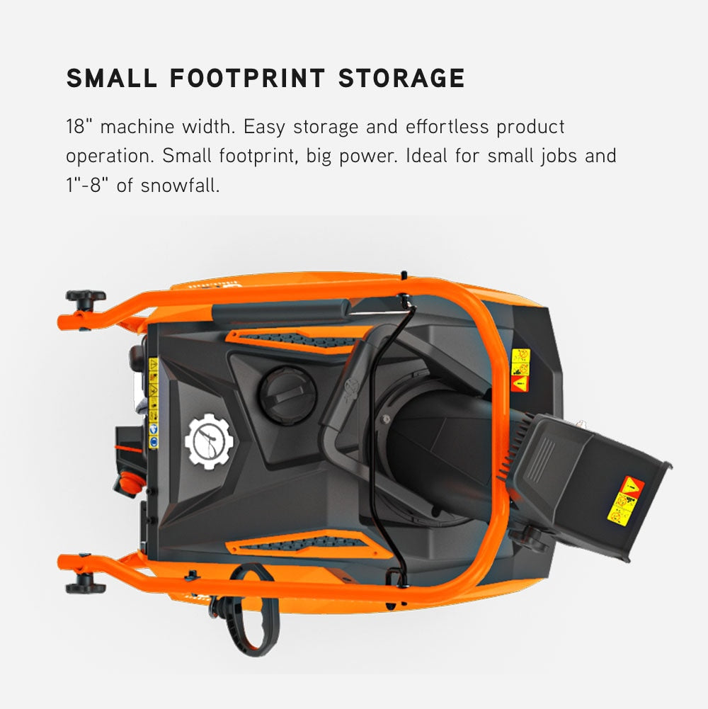 18 inch clearing width and 12 inch intake height is ideal for snow depths of 1 to 8 inches.