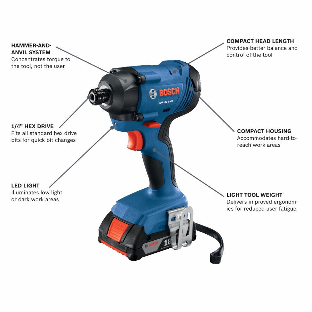 It features Bosch's hammer-and-anvil system, designed to concentrate torque to the tool, not the user.